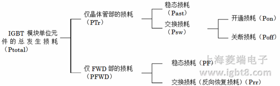 IGBT模塊由IGBT部分和FWD部分構(gòu)成,IGBT模塊的損耗源于內(nèi)部IGBT和反并聯(lián)二極管(續(xù)流FWD、整流)芯片的損耗,它們各自發(fā)生的損耗的合計(jì)即為IGBT模塊整體發(fā)生的損耗。另外發(fā)生的損耗可分為穩(wěn)態(tài)和交換損耗。如對(duì)上述內(nèi)容進(jìn)行整理可表述如下。